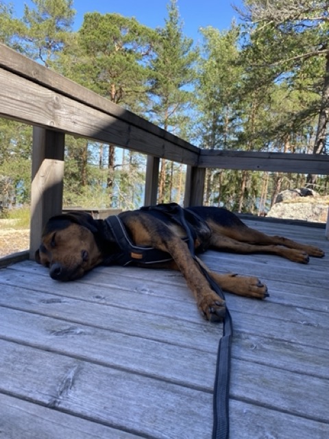 Samana aamuna pelastin myös Raikun kyyn puremalta – ei todellakaan kiva. Nyt siellä on kyitä ilmeisesti enemmänkin, terassirempasta ja sen aiheuttamasta melusta huolimatta, joten ei kyllä ole intoa sinne Raikun kanssa mennä. Su-aamun ulkoilukin oli yhtä pälyilyä ja jokainen oksa oli ensin kyy.