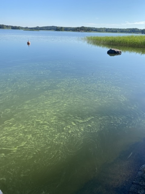 Mereenkään ei voinut enää su-aamulla pulahtaa, koska ranta oli täynnä sinilevää – nyt oikein lauttoina, mitä tuolla ei ole koskaan aiemmin ollut.